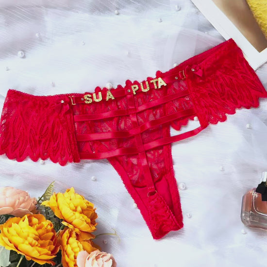 This custom thong features a delicate lace design, strappy silhouette, and gold-letter personalization along the waist — bold, confident, and unapologetically yours.